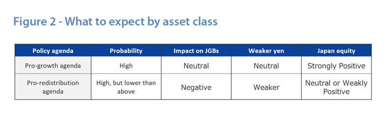 Our house view is that if the former takes precedence, this will be a clear positive for Japanese equities, potentially containing market concerns over fiscal expansion and helping to stabilize politically sensitive long-term yields.